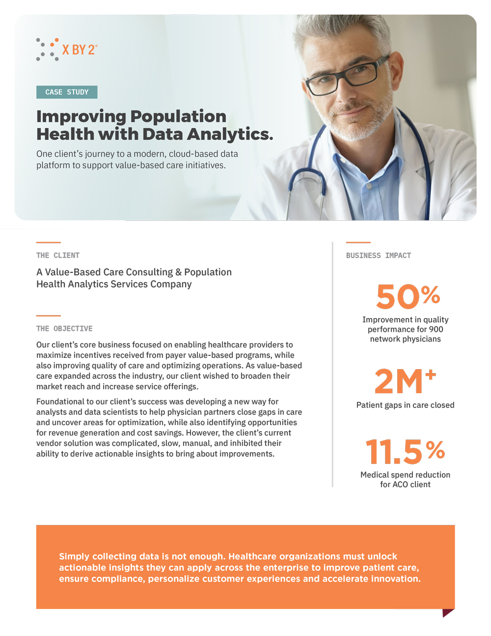 Technology is driving healthcare transformation, but data is fueling the engine. Simply collecting data is not enough. Healthcare organizations must unlock actionable insights they can apply across the enterprise to improve patient care, ensure compliance, personalize customer experiences and accelerate innovation. For over 20 years, X by 2 has worked with payers and providers to successfully build modern data platforms, enabling them to leverage critical analytics for: